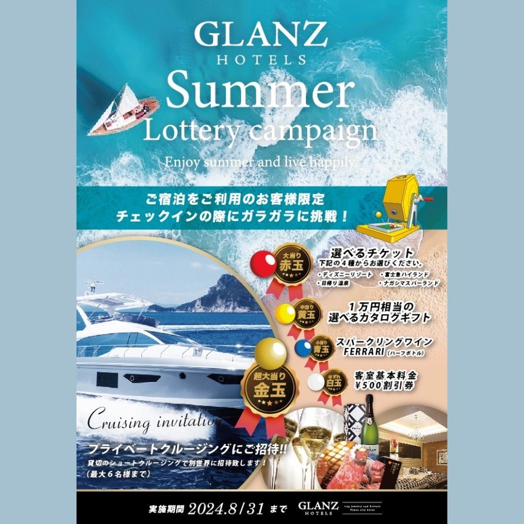 . [ご宿泊をご利用のお客様限定] チェックインの際にガラガラに挑戦! トップ賞はプライベートクルージング! その他ディズニーリゾート・富士急ハイランドチケットなど豪華景品をご用意しております。 ご宿泊の際は是非ご参加ください。 実施期間:2024/8/31まで ――――――――――――――――― ◆ HOTEL THE GLANZ ◆ -ホテル ザ グランツ麻布十番- 東京都港区麻布十番2-21-3 ▷ご予約は公式HPから ―――――――――――――――――