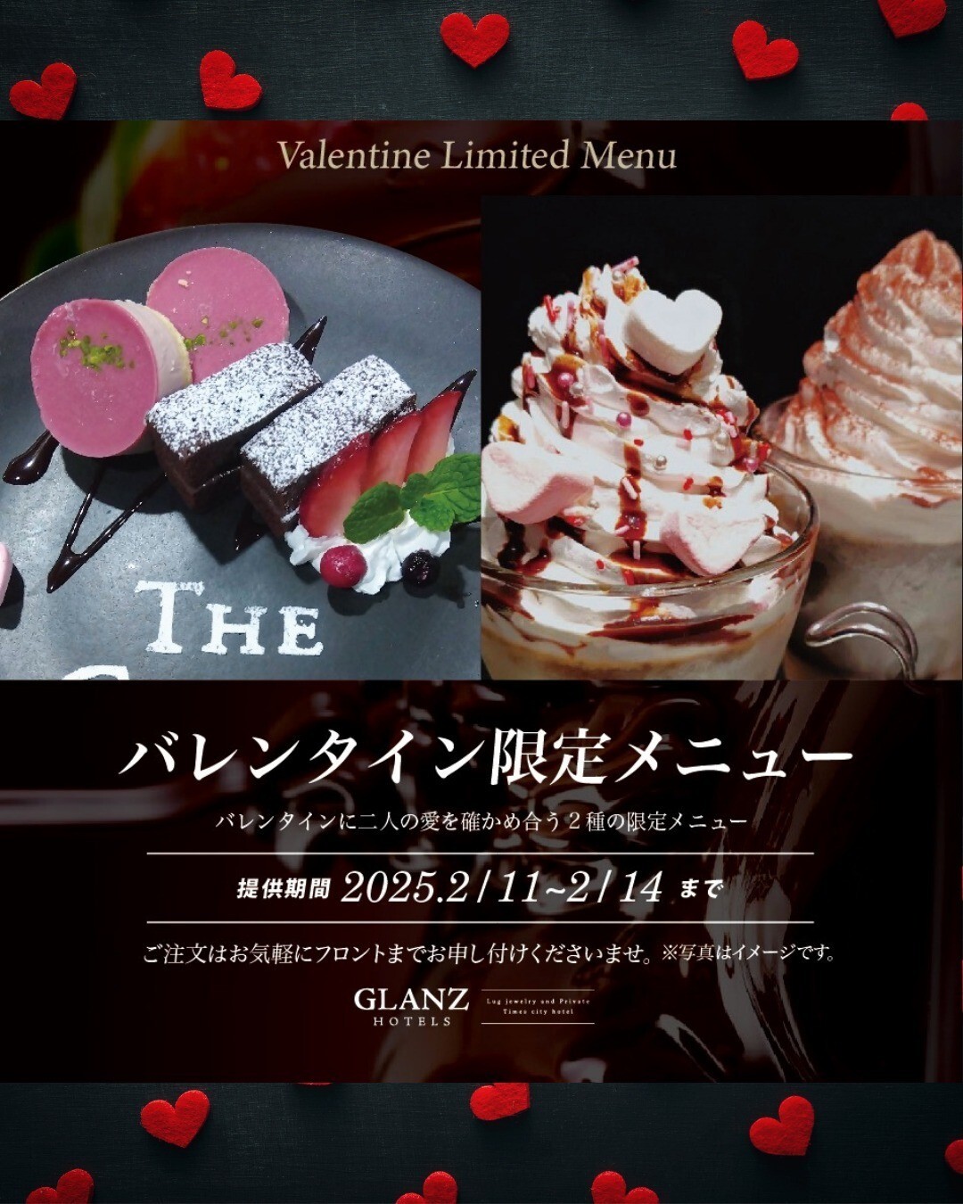 . 「バレンタイン限定メニューが登場」 ハッピーバレンタイン! 当ホテルでは、バレンタインということで期間限定の特別メニューを2種ご用意いたしました。 バレンタインに二人の愛を確かめ合う、特別なひとときをご堪能ください。 ご注文はお気軽にフロントまで。 実施期間:2025/2/11~2/14 Limited Valentine's Day Menu! Happy Valentine's Day! In honor of Valentine's Day, we have prepared two special menus for a limited time only. Please enjoy a special Valentine's Day moment to confirm your love for each other. Please feel free to place your order at the front desk. Period: 2025/2/11~2/14 ――――――――――――――――― ◆ HOTEL THE GLANZ ◆ -ホテル ザ グランツ麻布十番- 東京都港区麻布十番2-21-3 ▷ご予約は公式HPから ―――――――――――――――――