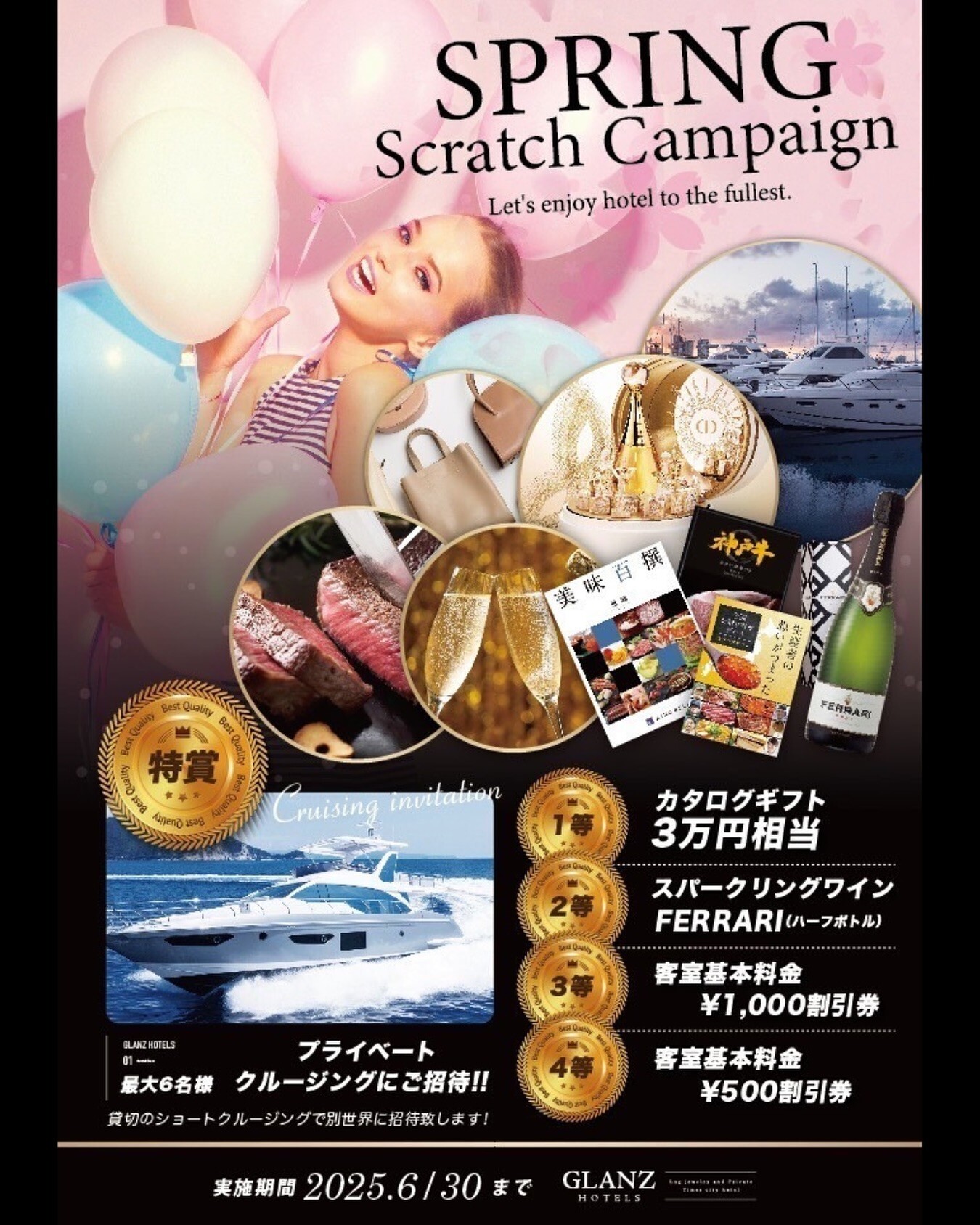 🌸 SPRING Scratch Campaign 🌸 心躍る春、ちょっと贅沢で特別なひとときを楽しみませんか? 当ホテルでは、春限定のスペシャルなスクラッチキャンペーンを開催中です。 特賞はなんと、最大6名様で楽しめるプライベートクルージング! ほかにも豪華カタログギフトやスパークリングワイン、客室割引券など嬉しい賞品を多数ご用意しています。 日常を抜け出して、非日常の贅沢を味わいましょう。 大切な人と一緒に、忘れられない春の思い出を作りませんか? スクラッチカードで運試し! 商品をゲットして、特別な春のひとときをお過ごしください!! Why not enjoy a little luxury and special time this exciting spring? Our hotel is currently holding a special spring-only Na Scratch Campaign. The grand prize is an incredible private cruise for up to six people! We also have many other great prizes available, including luxurious gift catalogs, sparkling wine, and accommodation discount vouchers. Escape from the everyday and experience extraordinary luxury. Why not create unforgettable spring memories with your loved ones? Try your luck with the scratch card! Get a prize and enjoy a special spring moment!! キャンペーン期間:~2025.6.30まで 皆様のご参加を心よりお待ちしております! ーーーーーーーーーーーーーーーーー ◆HOTEL THE GLANTZ◆ -ホテル ザ グランツ麻布十番- 東京都港区麻布十番2-21-3 ▷ご予約は公式HPから ーーーーーーーーーーーーーーーーー